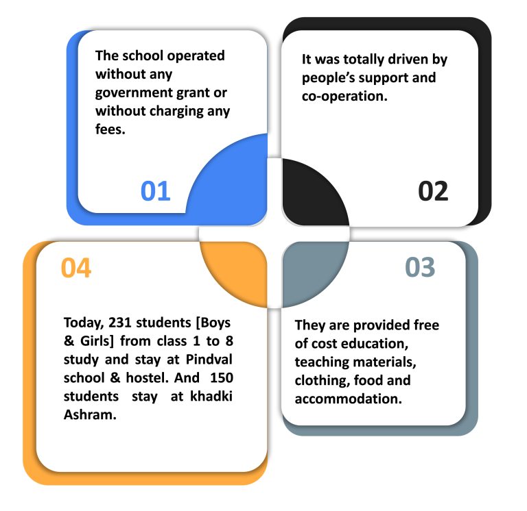 Kantibhai felt strongly that it was in our destiny to establish a school. Strongly inspired by Dr. Daulatsingh Parmar, a retired professor who came to Pindval with his wife, Manuben. They came here with lot of enthusiasm. It was through their help and drive that in June 1995, the previously abandoned Ambar Centre sinc e 1993, was converted into the school and hostel at Pindval. The school operated without any government gra nt or witho ut c harging a ny fees. Like everything else here that we did, it was totally driven by people supports and co-operation .Today, 260 students [Boys & Girls] from class 1 to 9 study and stay at this school & hostel. They live, eat, and study on the premises, where they are provided with clothing, books, notebooks, beds, trunks, utensils and everything else they need.They form teams to handle all the chores of the school including 1 cleaning, cooking, filling water, and gardening.